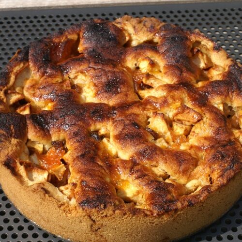 Rol van het overige deeg dunne rolletjes en leg die in een ruitmotief op de taart.