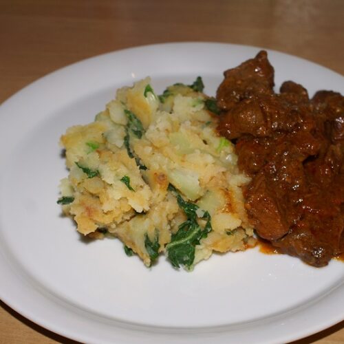 - Schil de aardappels en snijd ze in kleine stukjes, kook ze in water met een schep zout in circa 10 minuten gaar, giet ze af en stamp ze tot puree met de warme melk en boter. Roer de paksoi door de puree. Knijp de zachte knoflook uit de schil en roer die ook door de puree. Giet een lepel van de olie waarin de knoflook is gegaard over de stamppot en verwarm de stamppot nog een minuut op hoog vuur onder voortdurend roeren. Dien de stamppot op met de sukadelapjes en een lepel van de tomatensaus.