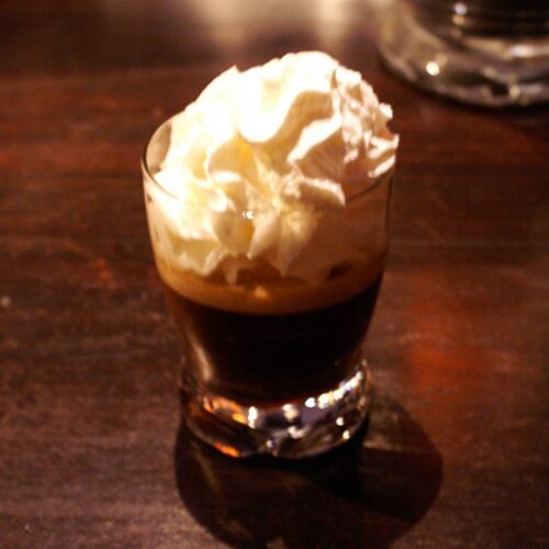 - Giet de koffie eroverheen en maak het geheel af met een eetlepel slagroom.