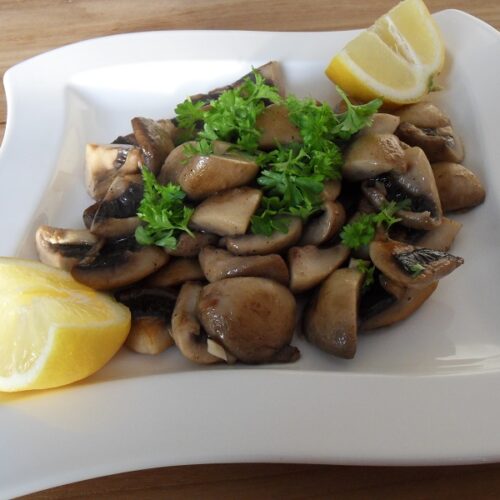 - Schep de gebakken champignons in een voorverwarmd schaaltje en serveer ze gloeiend heet of warm.
