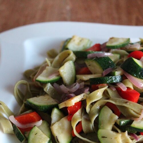 Kruidige tagliatelle met paprika, courgette, rode ui en tijm
