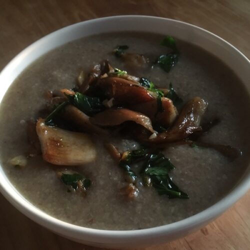 Wanneer er ’s avonds door ons gesport wordt, maak ik meestal een maaltijdsoep. Niet te zwaar, veel vocht, ideaal dus om tussen werk en sporten een kommetje van te eten. Dit keer werd het een kastanjechampignonsoep met een topping van oesterzwammen. Om de soep iets vullender te maken kookte ik een klein portie rijst mee. De soep is in een klein half uurtje klaar.