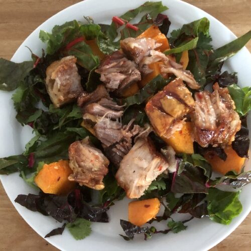 Knapperige varkensbuik met pompoen en koriandersalade